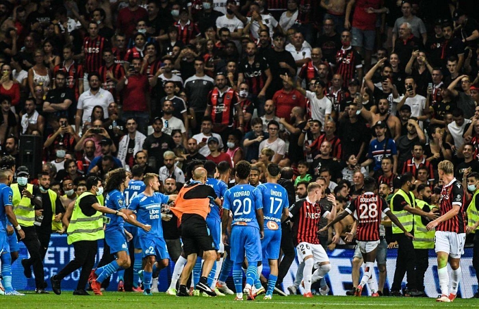 وتوقفت المباراة المجدولة ضمن الأسبوع الثالث في الدقيقة 78، بعد أن قذف مشجعو نيس، قارورات مياه خلال ركلة ركنية لمارسيليا، وأعاد اللاعب ديميتري باييه، زجاجة بقذفها نحو المدرجات، قبل أن يقتحم بعض المشجعين، المستطيل الأخضر.