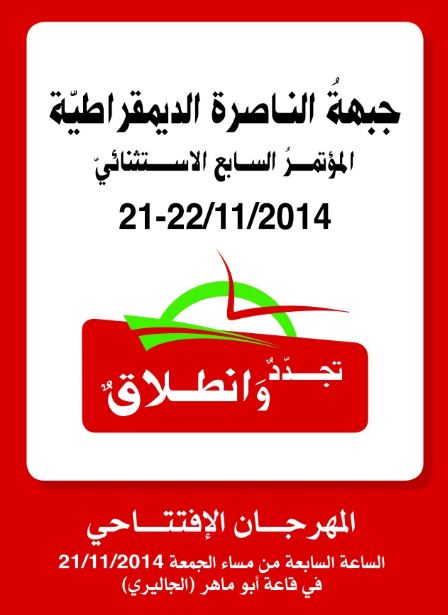 الناصرة- من لجنة الاعلام والتثقيف في جبهة الناصرة الديمقراطية- تشهد قاعة "ابو ماهر- الجاليري" في مدينة الناصرة، عند الساعة السابعة من مساء الجمعة، انطلاق اعمال المؤتمر السابع الاستثنائي من خلال مهرجان افتتاحي احتفالي جماهيري يعقبه في اليوم التالي، وعلى مدار ساعات النهار والليل، انعقاد جلسات النقاش والتصويت على مشاريع قرارات وانتخاب هيئات جديدة لقيادة الجبهة حتى المؤتمر القادموذلك بمشاركة المئات من اعضاء الجبهة من كافة الشرائح العمرية والاجتماعية والاهتمامات والفعاليات الشعبية والاحياء النصراوية.