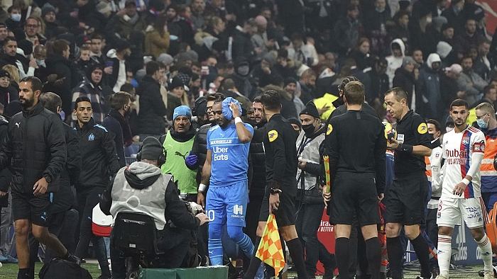 تقرر إلغاء مباراة أولمبيك ليون ونظيره مارسيليا، بعدما ألقت الجماهير قارورة مياه اصطدمت برأس ديميتري باييه، لاعب الفريق الضيف.
