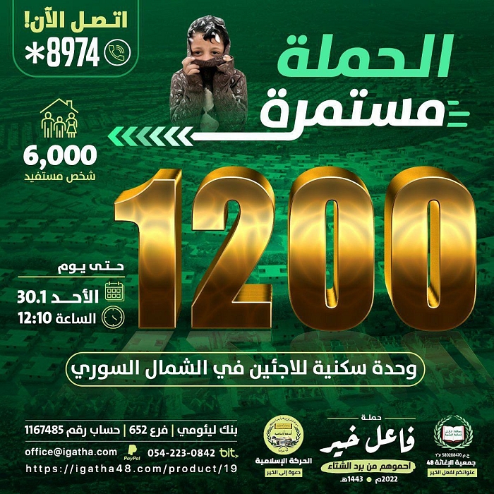 نجحت جمعية الإغاثة48- الحركة الإسلامية، أمس الأول السبت، بجمع تبرعات لبناء أكثر من 1200 وحدة سكنية من الباطون للأهل اللاجئين في مخيمات الشمال السوري، بكلفة تصل حوالي 6 مليون شيكل، وذلك خلال فقط 10 ساعات من قيامها بإطلاق حملة الإغاثة "فاعل خير" ببث مباشر عبر موقعي "إحنا تي ڤي" و "وازكام، وعبر عدة إذاعات والعديد المواقع الإخبارية ومواقع التواصل الاجتماعي للناشطين والمتطوعين.