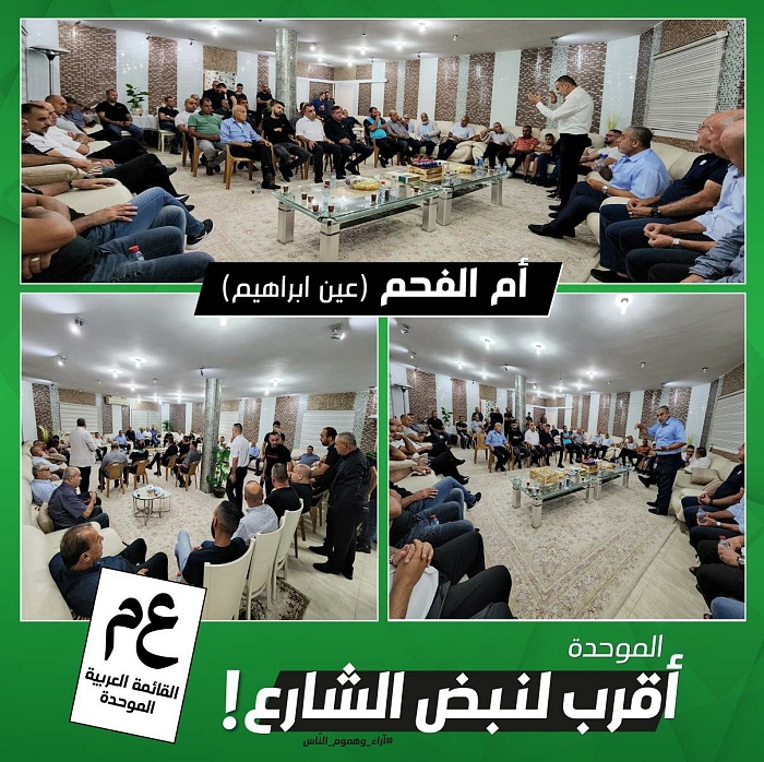 اجتماع انتخابي بيتي واسع، تأييدًا ودعمًا للموحدة، في بيت المحامي مصطفى إغبارية في حي عين إبراهيم في مدينة أم الفحم، بمشاركة النائب وليد طه والمرشح الأستاذ عبد الكريم مصري.