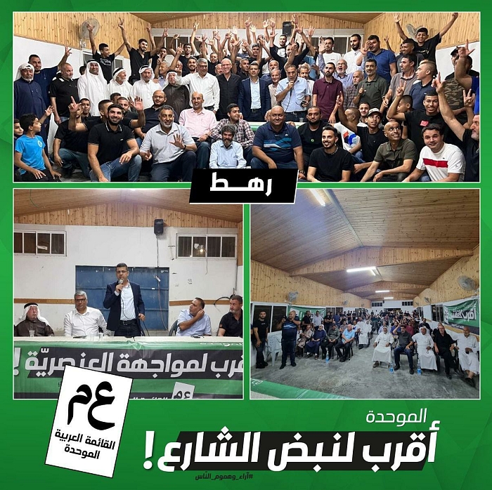 اجتماع انتخابي حاشد في ديوان آل العمور في مدينة رهط تأييدًا ونصرةً للموحدة، بمشاركة المرشح وليد الهواشلة والمرشح عطا أبو مديغم، والأستاذ يوسف أبو جعفر مدير حملة الموحدة في رهط، ووجهاء عائلة العمور وعائلات الحيّ.
