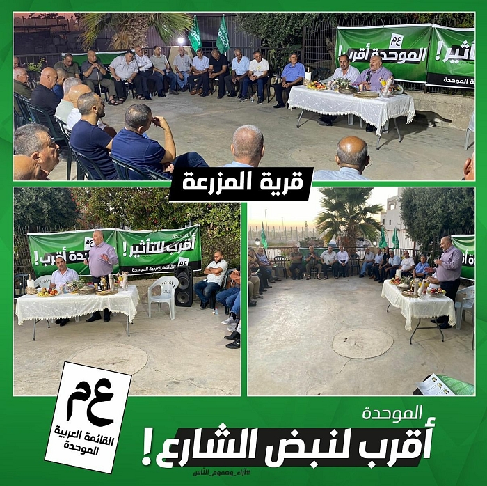 حلقة بيتية واسعة في قرية المزرعة في بيت السيد أمير عوض تأييدًا ودعمًا للموحدة، بمشاركة النائب د. منصور عباس، وبحضور رئيس المجلس السيد فؤاد عوض.