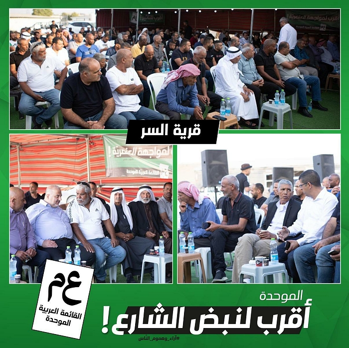 مشاركة واسعة من أهالي قرية السر والمنطقة الجنوبية في النقب في الاجتماع الانتخابي الذي عقد دعمًا وتأييدًا للموحدة، بمشاركة النائب د. منصور عباس ومرشحي النقب وليد الهواشلة وعطا أبو مديغم.