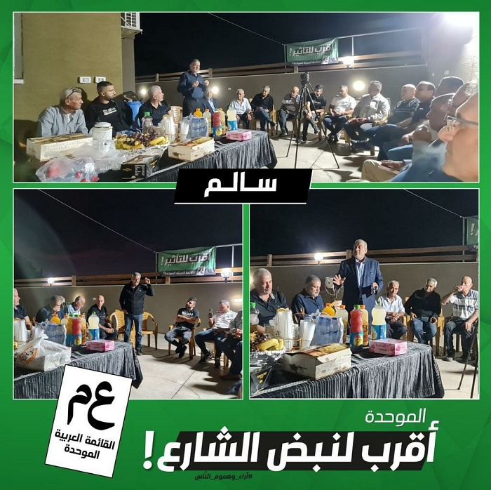 حلقة انتخابية دعمًا وتأييدًا للموحدة ونهجها الأقرب لنبض الشارع، في قرية سالم، في بيت السيد نبيل صبيحات (أبو شادي)، بمشاركة النائب وليد طه، والمرشح عن منطقة المثلث الشمالي عبد الكريم مصري، ونائب رئيس المجلس السيد عمر صبيحات (أبو العبد).