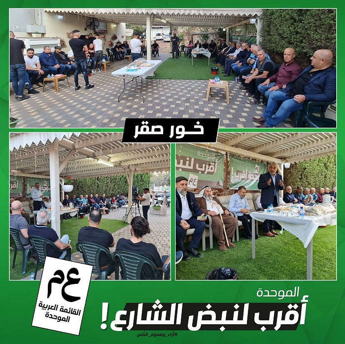 حلقة انتخابية بيتية تتحول إلى اجتماع حاشد دعمًا وتأييدًا للموحدة ونهجها الأقرب لنبض الشارع، في قرية خور صقر، في بيت السيد محمد مصطفى (أبو الهيثم)، بمشاركة النائب وليد طه، والأستاذ عبد الكريم مصري المرشح السادس بالموحدة- مرشح وادي عارة والمثلث الشمالي.