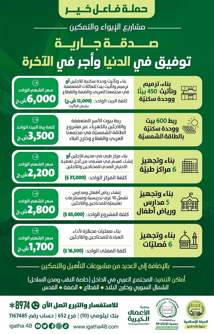 أهلنا الأحباب، الإغاثة48 تفتح أمامكم أبوابًا من الصدقة الجارية، عن أنفسكم وأولادكم ومرضاكم وأمواتكم. تبرّعوا وساعدوا آلاف المحتاجين واللاجئين والأسر المتعفّفة في داخل البلاد وخارجها، من خلال مشاريع الإيواء والتمكين ضمن حملة فاعل خير 2023م.