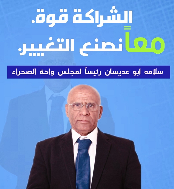 يشرفني أن أُعلنَ لكُم بقناعةٍ تامةٍ عن قرارِ تُرِشّحي لرئاسة المجلس الاقليمي واحة الصحراء، راجياً من الله أولاً التوفيقَ ومن ثُمَّ بدعمكم ومساندتكم؛ لِنَتَمِكن من إحداثِ التغييرِ الحقيقي في مسيرةِ بناء قرانا وتطويرها كما تستحق وكما تستحقون.
