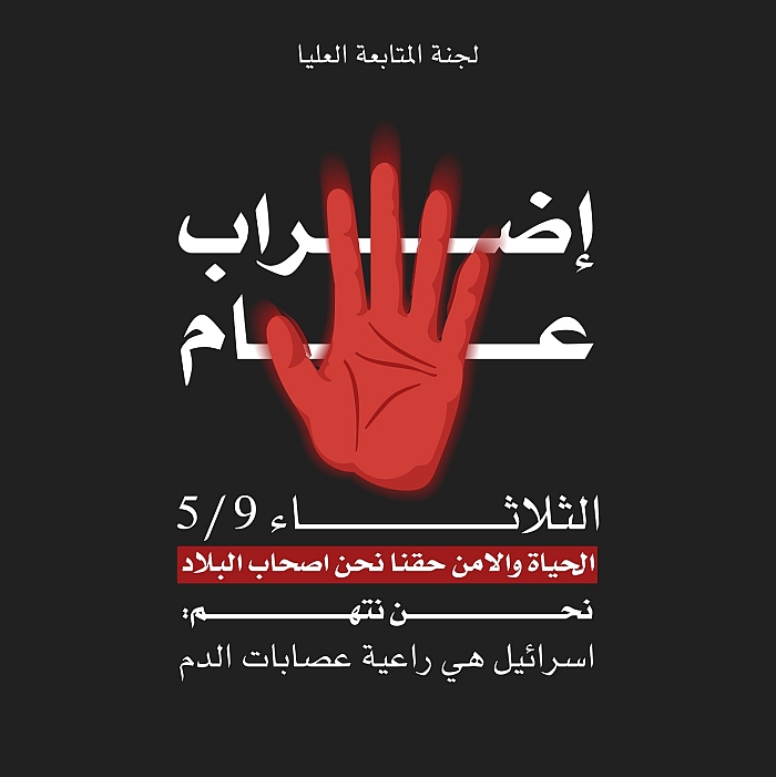 تدعو لجنة المتابعة العليا جماهيرنا العربية للالتزام بالإضراب العام الذي أقرته لجنة المتابعة في اجتماعها الطارئ أمس الأحد في كفر قرع، على ضوء استمرار استفحال دائرة الجريمة والعنف في المجتمع العربي والتواطؤ الحكومي الرسمي المفضوح، لجعل مجتمعنا يغرق في حالة الرعب والدم، ويحصي الضحايا القتلى والمصابين، لهذا فإن اضرابنا يوم غد يجب أن يعكس الموقف الوطني الجماعي ضد الجريمة الدائرة ودعم الحكومة لها، من أجل وقف ما يجري وضمان حياة آمنة ومستقبل أفضل لأبنائنا والأجيال الناشئة.