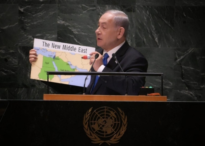 وحمل نتنياهو خارطة أوضحت كيف كانت اسرائيل معزولة عن محيطها العربي عام 1948 وكيف ستكون في المستقبل قائلاً ان "خريطة الشرق الأوسط ستتغير تماما بالنسبة لنا".