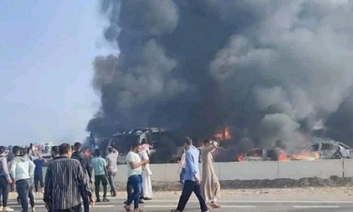تداول رواد مواقع التواصل الاجتماعي مقاطع فيديو وصور لحادث مروري مروع بين حافلة وعدد من السيارات على طريق القاهرة الإسكندرية الصحراوي.