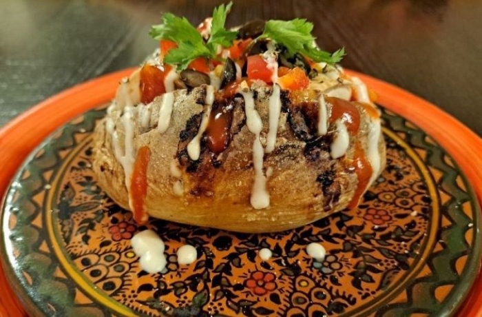 هكذا يكون الشكل النهائي بعد حشو البطاطا بالمكونات | تصوير: Ehna TVبعد استواء حبة البطاطا في الفرن نخرجها ونقوم بشقها وهي ساخنة بسكين من الوسط فقط، مع ابقاء اطرافها وقاعدتها متماسكة. ونقوم بتفكيك البطاطا من الوسط بمساعدة شوكة. ونضيف رشة ملح وفلفل أسود خشن والقليل من الزبدة (في الوسط)، مع القليل من كريمة الباشاميل التي قمنا بتحضيرها، ثم نحشو المنطقة المفتوحة من البطاطا (بداخلها) بالقليل من جبنة الشيدر والموزريلا والذرة والفلفل الأحمر او الأصفر المقطع بمربعات صغيرة مع شرائح من الزيتون الاسود او الأخضر وشرائح من الفقع الطازج. ثم نسكب قوقها كريمة الباشاميل.