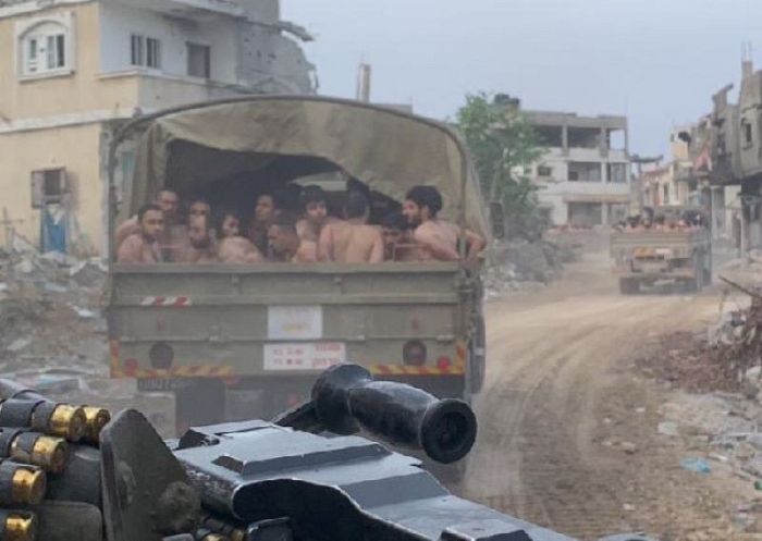 تداول ناشطون على مواقع التواصل، اليوم الخميس، صورا تظهر قيام القوات الاسرائيلية باعتقال المدنيين في القطاع وتجميعهم في شاحنات (!!) بعد ان تم تعريتهم وخلع ملابسهم عنهم، بالكامل تقريبًا. وواضح ان الحديث يجري عن مواطنين عاديين ومدنيين، وليس مقاتلين من كتائب القسام او سرايا القدس "وقعوا في الأسر"، ذلك ان المقاتلين في المعارك لا يرتدون الحفايات التي تملأ الساحة وتعود الى المعتقلين بعد اجبارهم على خلعها. وهذه بعض الصور المتداولة: