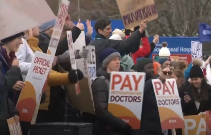 تصوير: شاشة فيديووكانت "الرابطة الطبية البريطانية" اعلنت الإضراب بعد انهيار المحادثات مع الحكومة. وأفادت النقابة أنه عُرض على الأطباء المبتدئين زيادة أجور نسبتها 3% إضافة إلى الزيادة بنسبة 8.8% التي منحت لهم في وقت سابق من العام الماضي. لكنها رفضت العرض نظرًا إلى أن المبلغ سيقسّم بشكل غير منصف على الأطباء على مختلف درجاتهم وسيمثّل "خفضًا للأجور بالنسبة للعديد من الأطباء".