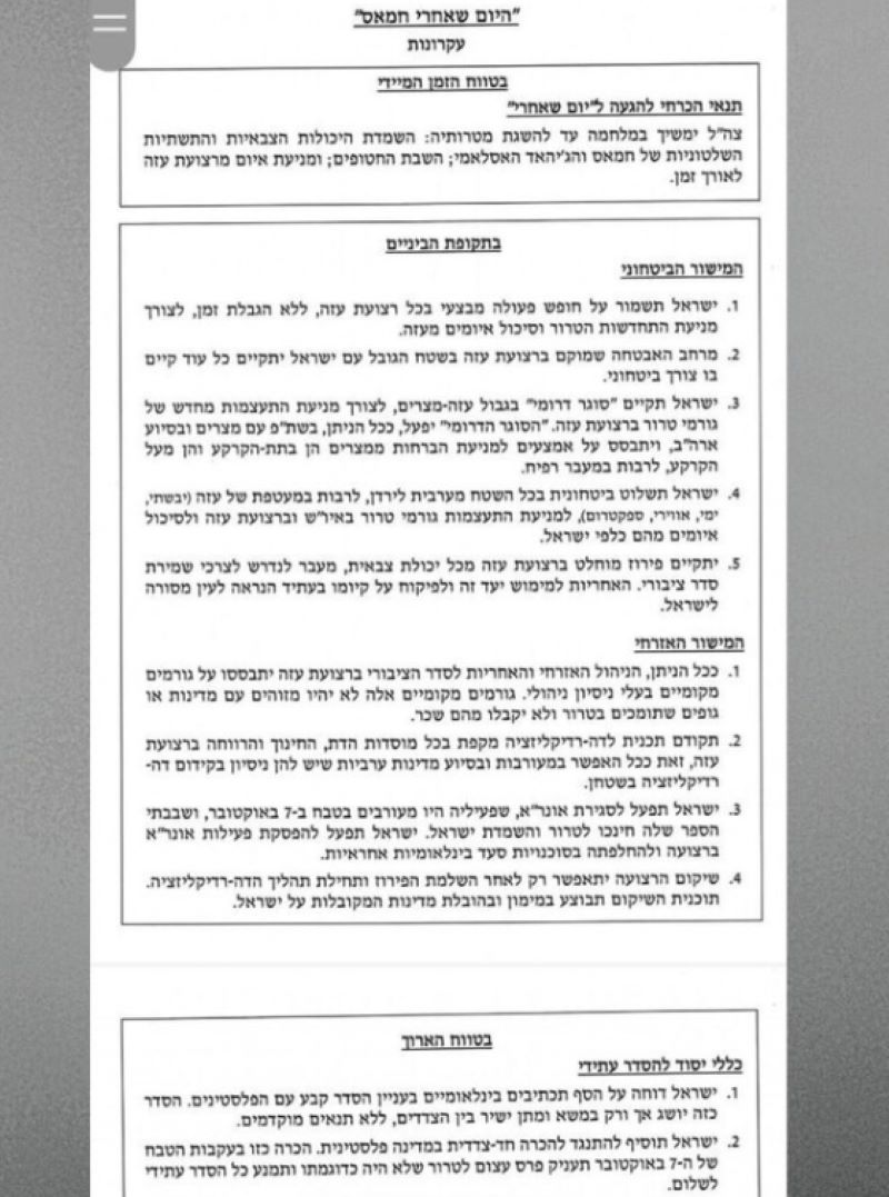 صورة زنكوغرافية من الوثيقة/ الخطة لـ"اليوم التالي" التي عممها نتنياهو على اعضاء كابنيت الحربنتنياهو يرمم ائتلافه الحاكم بهذه الخطة، ومع ذلك تكون فعليا خطة غير قابلة للتحقيق لليوم التالي لحكمه وليس فقط لليوم التالي للحرب. والثمن الفلسطيني المباشر للخطة يعني راهنا اجتياح رفح ومضاعفة الكارثة على ارض غزة.