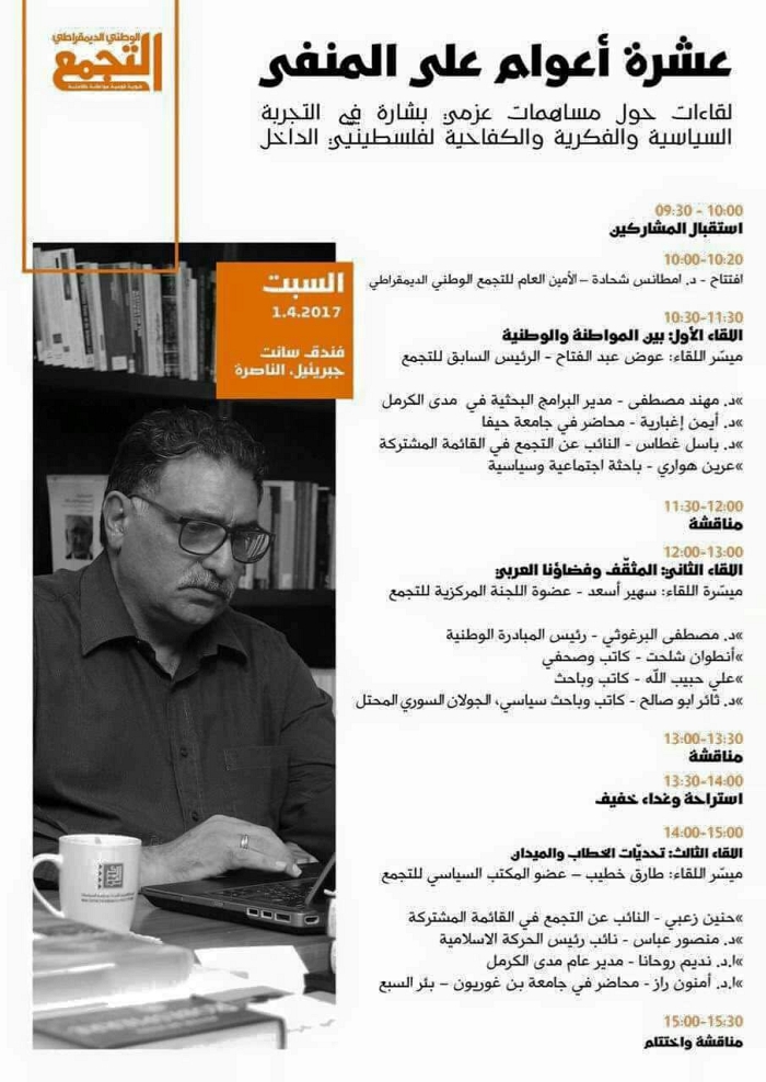 عقد التجمع الوطني الديمقراطي، اليوم السبت، مجموعة لقاءات وحوارات فكرية ، في فندق سانت جبريئيل بمدينة الناصرة، احتفاءً بالمفكر العروبي الدكتور عزمي بشارة، احد ابرز مؤسسي الحزب، بمشاركة مثقفين وسياسيين وأكاديميين، بمناسبة مرور عشرة أعوام على المنفى القسري لبشارة، حضرها العشرات من اعضاء الحزب واصدقائه، ولفيف من النشطاء، حيث شكلت اللقاءات قراءات فكرية ومداخلات لمجموعة من الأكاديميين والمثقفين والناشطين، حول مساهمات الدكتور بشارة في التجربة الفكرية والسياسيّة والكفاحية لفلسطينيي الداخل، نوقشت في ثلاثة محاور؛ بين الوطن والمواطنة؛ المثقف وفضاؤنا العربي وتحديات الخطاب والميدان.
