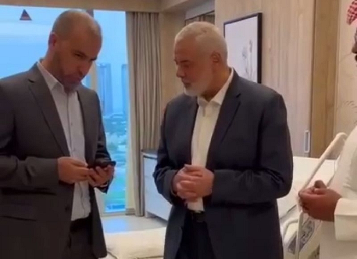 وننشر هنا فيديو يظهر لحظة تلقي اسماعيل هنية نبأ استشهاد أبنائه واحفاده.