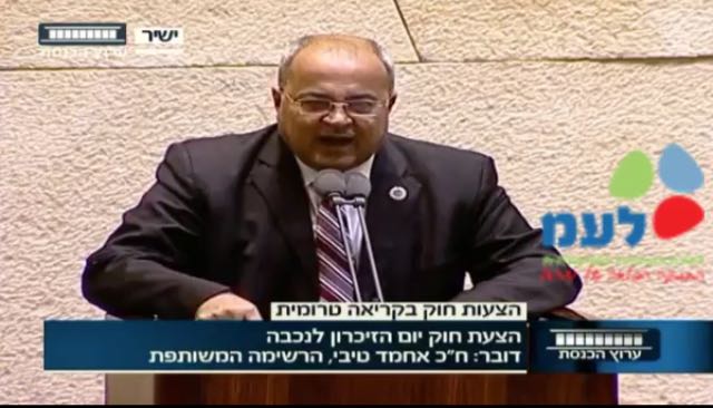 ناقشت الهيئة العامة للكنيست, اليوم الاربعاء, اقتراح قانون "احياء ذكرى يوم النكبة" الذي تقدم به النائب د. أحمد الطيبي, رئيس العربية للتغيير – القائمة المشتركة والنائب اسامة سعدي, والذي يقضي بأن يتم اعتماد تاريخ 15/05, من كل عام, ذكرى يوم النكبة, حيث يتم خلال هذا اليوم من كل عام عند الساعة 12 ظهرا اطلاق صفارات الانذار والوقوف دقيقتين حداد وايقاف حركة السير حدادا على أرواح الضحايا الذين استشهدوا خلال النكبة. كما ويقضي اقتراح القانون بأن تقام في هذا اليوم فعاليات تثقيفية لاحياء ذكرى النكبة, وتنظيم مسيرات عودة الى القرى المهجرة التي اقتلع سكانها منها عام 1948 وما تلاها, وتقوم الاذاعات الرسمية والمؤسسات الجماهيرية بتقديم برامج هادفة تخص ذكرى يوم النكبة. حيث على عكس ذلك قامت الحكومة الاسرائيلية بتشريع قانون لمعاقبة من يحيي النكبة وهذا القانون هو رد لذلك.