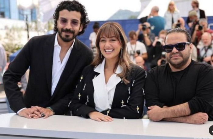 مخرج فيلم "نورة"، توفيق الزايدي (يسار)، وبطلا الفيلم يعقوب الفرحان، وماريا بحراوي، خلال مشاركتهم في مهرجان "كان"