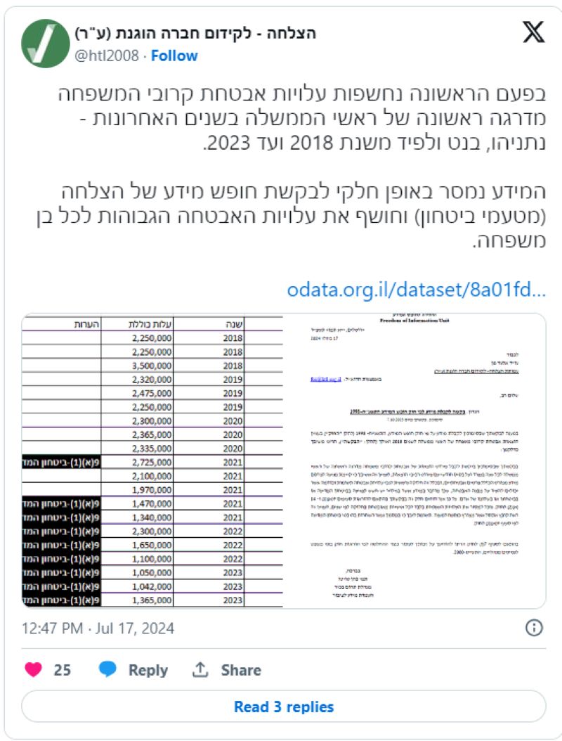 ويظهر من جواب الدولة أنه في الأعوام 2018-2020 تم صرف زوجة رئيس الوزراء سارة نتنياهو بتكلفة سنوية تبلغ حوالي 2.3 مليون شيكل سنويا لتأمين حراسة زوجة رئيس الحكومة، سارة نتنياهو، فيما كلّفت حراسة نجله أفنير 3.5-2.3 مليون شيكل سنويا، ونجله يائير 2.5-2.2 مليون شيكل سنويا.