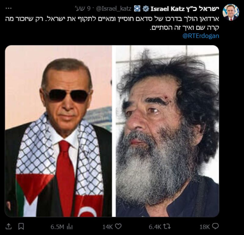 وأثارت تصريحات الرئيس التركي غضب المسؤولين الإسرائيليين. وفي معرض الرد الإسرائيلي على التصريحات، نشر وزير الخارجية، يسرائيل كاتس، تدوينة على منصة X، أشار فيها الى مصير الرئيس العراقي السابق، صدام حسين، مرفقًا صورة تضم صدام حسين وأردوغان. وكتب يقول: "أردوغان يسير على خطى صدام حسين ويهدد بمهاجمة إسرائيل.. فقط دعه يتذكر ما حدث هناك وكيف انتهى الأمر".