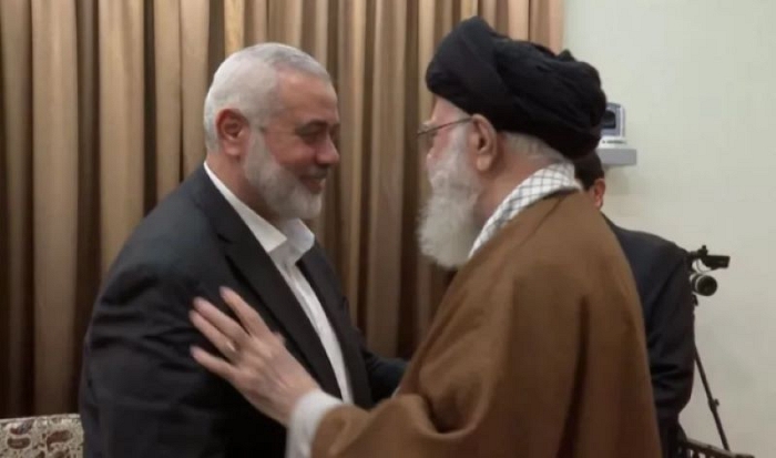 خامنئي عند استقباله هنية قبل ساعان من اغتياله | تصوير: شاشة - وسائل إعلام إيرانية