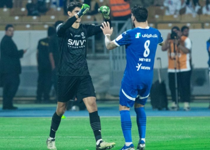 لاعب الهلال، البرتغالي روبن نيفيز، مع المغربي ياسين بونو، حارس المرمى، بعد إجادته في ركلات الترجيح أمام الأهلي | المركز الإعلامي ـ الهلال