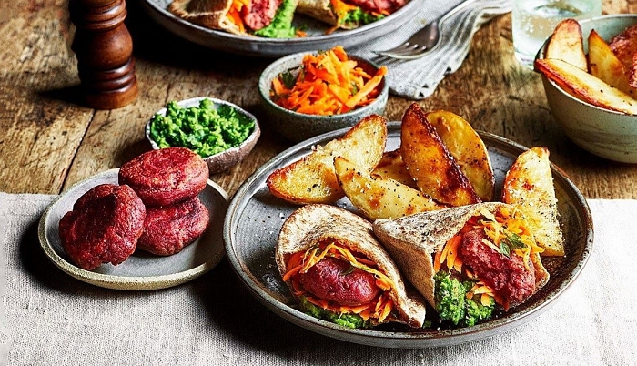 - دهن الخبز بملعقة من هريس البازلاء وفلافل االشمندر (البنجر) وبعض سلطة الملفوف بالجزر.