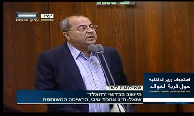 وجاء في استجواب الطيبي للوزير: "في العام 1993 اعترفت وزارة الداخلية بقرية الخوالد الواقعة في الجليل. اليوم بعد عشرات السنوات منذ هذا الاعتراف ما زالت القرية, التي تفتقر الى بنية تحتية سليمة, تعاني من ظروف حيات ومعيشية صعبة, الأمر الذي يعرقل انخراط أبناء هذه البلدة في المجتمع ويفاقم الأوضاء الصعبة في القرية".