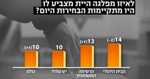 وبحسب الاستطلاع، الذي نشرته "القناة العاشرة" مساء الأحد 8 شباط 2015، وأشرف عليه البروفيسور كميل فوكس والدكتور أريئيل أيالون، يحصل "الليكود" و"المعسكر الصهيوني" على 23 مقعدًا لكل منهما، و"البيت اليهودي" على 14 مقعدًا، و"القائمة المشتركة" على 13 مقعدًا. ويليهم كلُ من "يش عتيد" و"كولانو" بواقع 10 مقاعد لكل منهما، ثم 6 مقاعد لكل من "شاس" و"يهدوت هتوراه"، و5 مقاعد لكل من "يسرائيل بيتنو" و"ميرتس" و"هعام إيتانو".