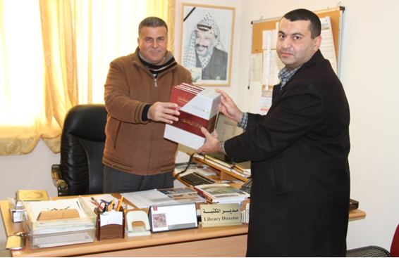وفي ختام الزيارة توجه الوفد الى مكتبة الجامعة والتقوا مديرها الاستاذ حسن السعيد الذي رحب بهم وقدم لهم شرحا عن المكتبة وعن عدد الكتب فيها والخدمات التي تقدمها للطلاب و الآليات التي يتم بموجبها استعارة الكتب وتداولها ، وفي ختام اللقاء سلّم رئيس المؤسسة مدير المكتبة نسخة عن الموسوعة كهدية وكمرجع يستعين به الطلاب في دراستهم المتعلقة بالمقدسات الفلسطينية .