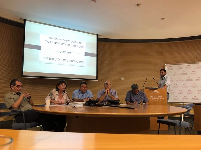 وتحدث كل من بروفيسور محمود غنايم، رئيس مجمع اللغة العربية، وبروفيسور محمد امارة، رئيس الرابطة لدراسة اللغة والمجتمع في اسرائيل، وبروفيسور ميخاييل كريني، عميد كلية الحقوق في الجامعة العبرية، والمحامية تالية ساسون، رئيس الصندوق الجديد لاسرائيل. وطرح المتحدثون ملاحظات وافكار حول مكانة العربية وسُبل حمايتها في ظل مضامين قانون الاساس الجديد.