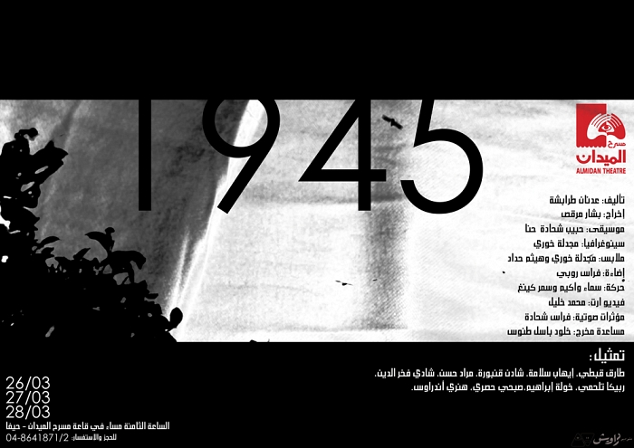 تخرج مسرحية "1945"؛ الإنتاج الجديد لمسرح الميدان، إلى الخشبة أيام الخميس والجمعة والسبت 26/27/28 آذار 2015، وذلك عند الثامنة مساءً في قاعة مسرح الميدان في حيفا. حيث تقتطع المسرحية شريطًا من ذاكرة قرية فلسطينية قبل النكبة، بتفاصيله الخاصة والعامة؛ بحيوات شخوصه الإنسانية وبتأثير الانتداب البريطاني والهجرة الصهيونية عليها. وبمفارقاته الصارخة؛ حيث فرحة موسم الحصاد والأعراس تقابلها خسارة الوطن، الثورة من أجله في مقابل الضعف الذي يتبدى في خيانته.