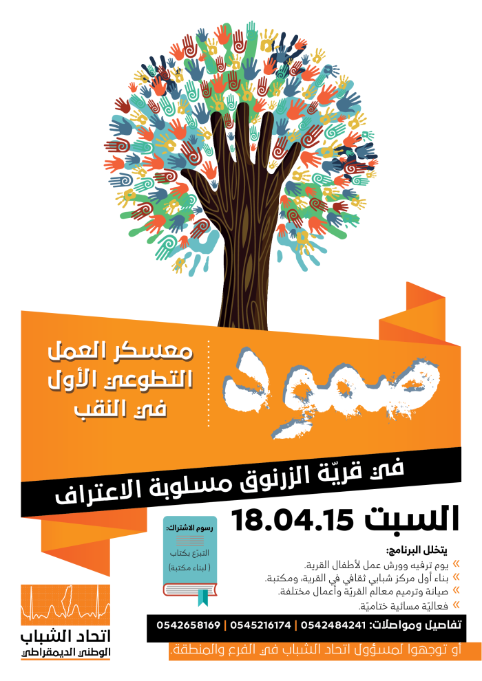 ينظم اتحاد الشباب الوطني الديمقراطي (شبيبة التجمع) يوم السبت القادم، معسكرًا تطوعيًا في قرية الزرنوق مسلوبة الاعتراف في النقب، يشارك فيه مئات من أعضاء الحزب والشبيبة ومتطوعين آخرين يهدف لتعزيز صمود أهلنا في بيوتهم في النقب، وبناء مرافق اجتماعية لخدمتهم.