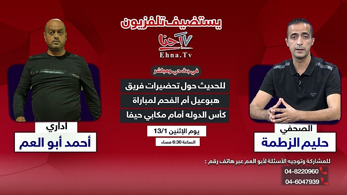 يستضيف تلفزيون إحنا Tv يوم الإثنين 13/1 الساعة السادسة والنصف مساء إداري فريق هبوعيل أم الفحم أحمد أبو العم في بث حي ومباشر ليتحدث مع مقدم البرنامج حليم الزطمة حول التحضيرات لمباراة كأس الدوله أمام مكابي حيفا.