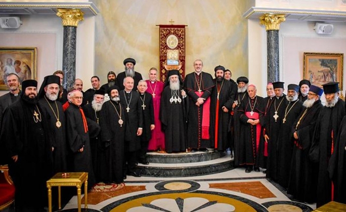بعد متابعة حثيثة للخطة الأمريكية للسلام والمعروفة إعلامياً باسم "صفقة القرن" ومحتواها التفصيلي، وبعد الاطلاع على ردود أفعال جميع الجهات المعنية، نؤكد نحن، بطاركة ورؤساء كنائس الأراضي المقدسة، تمسكنا بوجوب تحقيق سلام عادل وشامل لقضية الشرق الأوسط الأولى بما يضمن الأمن والسلام والعيش بحرية وكرامة لجميع شعوب المنطقة.