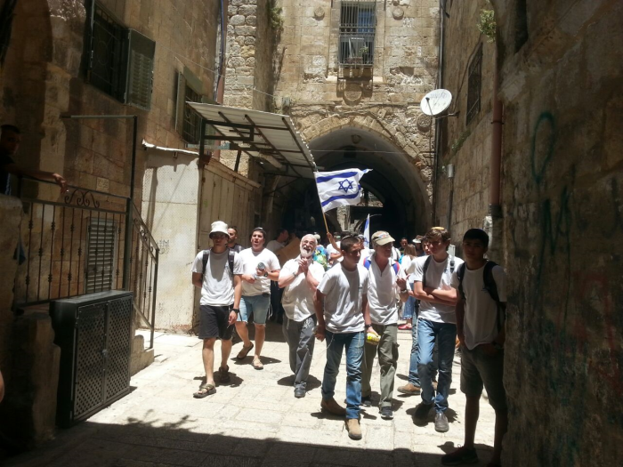 وبيّن أن مجموعات شبابية ونسائية من المستوطنين تنتشر وتجوب كافة ارجاء البلدة القديمة ومحيط المسجد الاقصى ، وتقوم برقصات استفزازية واطلاق الشعارات المناوئة للقدس والمسجد الاقصى وتدعو الى بناء الهيكل المزعوم على حسابه ، لافتا الى أنهم يرتدون قمصانا تحمل عبارات تهويدية واعلاما اسرائيلية وصورا للهيكل المزعوم.