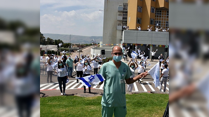 وفيما اقتصرت "الاحتفائية" في أغلب المستشفيات على مشاركة عشرات من الطواقم الطبية في التقاط صور من داخل أقسام "الكورونا" وأقسام أخرى وتوزيعها على الجمهور العام من خلال شبكات التواصل الاجتماعي، اختار مستشفى بوريا "احتفائية خاصة"، لم تقتصر على التقاط الصور للعشرات داخل أقسام المستشفى، كما بقية المستشفيات، انما أقام "استقبالاً حافلاً" في باحات المستشفى الخارجية لطائرات سلاح الجو تزامنًا مع تحليقها في سماء المستشفى. وحملت الطواقم الطبية فيه أعلام إسرائيل تعبيرًا عن الاحتفاء بيوم الاستقلال. ووزع مكتب الناطق الرسمي بأسم المستشفى صورة لمضيء شعلة الاستقلال، أحمد بلاونة، نرفقها هنا بالخبر، وهو يحتفي بالاستقلال ويحمل العلم الاسرائيلي، كونه أحد الممرضين في قسم معالجة مرضى الكورونا في مستشفى بوريا، وقد شارك في هذه المراسم (الصورة بلطف من مكتب الناطق الرسمي بأسم مستشفى بوريا)