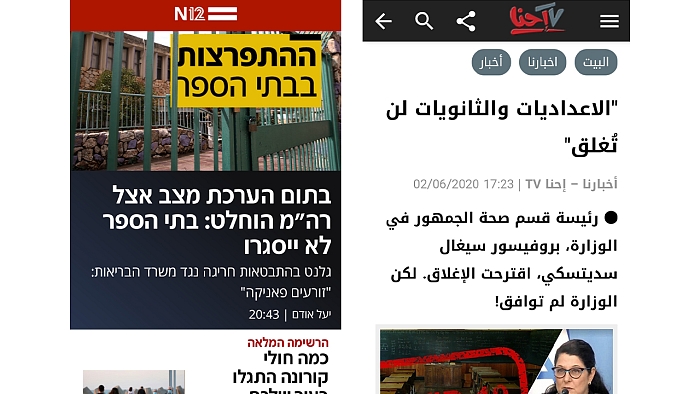 في الوقت الذي تناقلت فيه اغلبية وسائل الاعلام العبرية في البلاد، المرئية والمكتوبة، ابتداءً من بعد ظهر اليوم (الثلاثاء)، خبرًا مفاده ان وزارة الصحة قررت التوصية بإغلاق المدارس الإعدادية والثانوية في جميع انحاء البلاد، كتبت أخبارنا – إحنا TV، وكانت الوحيدة بذلك من بين كل وسائل الاعلام العبرية والعربية، انه لن يتم اغلاق الاعداديات والثانويات، بعكس ما يشاع في وسائل الاعلام، وان وزارة الصحة لم تقرر التوصية.