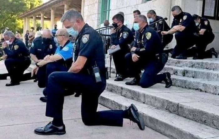 صورة بألف كلمة! رجال شرطة أمريكيين يركعون أمام المتظاهرين تأييدًا ودعمًا لمطالبهم بالعدالة والمساواة وضد العنصرية المتفشية في النظام الأمريكي ضد الأمريكيين من أصل أفريقي.