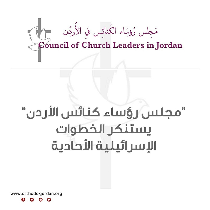 استناداً لتزامن الأحداث المؤلمه التي تمر بها كنائس الأراضي المقدسة في الفترة الأخيرة، خاصة بعد موافقة المحكمة الإسرائيلية الإستيلاء على أملاك تابعة للكنيسة الأرثوذكسية في باب الخليل بالبلدة القديمة في مدينة القدس المحتلة لمستوطنين متطرفين، وإقتراب إقتراف جريمة تطبيق الإحتلال لقرار ضم أراض في الضفة الغربية يؤكد مجلس رؤساء الكنائس في الأردن على موقفه الحازم برفض كل قرار يؤسس لمرحلة لا إنسانية من الظلم على هذه الأراضي المقدسة وقتل الأمل الأخير في صنع أي عملية سلام في الشرق الأوسط.