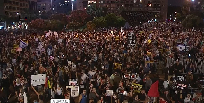 "حكومة الكذّابين: حرروا الأموال حالاً"! تحت هذا الشعار يتظاهر الأولوف بتل أبيب (ساحة رابين)، في هذه الإثناء (مساء السبت)، في مظاهرة الاحتجاج الاقتصادي على ما آلت إليه أوضاع الكثيرين في البلاد على خلفية الأزمة الاقتصادية واغلاق أماكن العمل، بينما لم يجر تعويض هذه الفئات من قبل الحكومة.