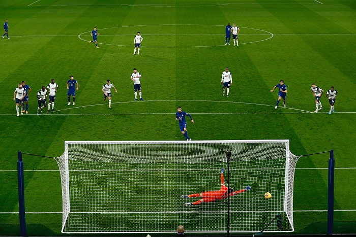 واحتسب الحكم ركلة جزاء لتشيلسي، بعدما عرقل إيريك داير، مدافع توتنهام، منافسه تيمو فيرنر داخل منطقة الجزاء، انبرى لها المتخصص جورجينيو وسددها بقوة على يمين الحارس هوجو لوريس، معلنا تقدم الضيوف بالنتيجة عند الدقيقة 24.