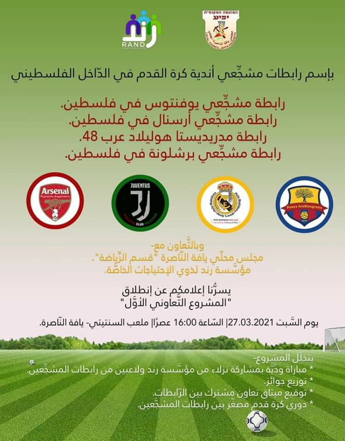 بالتعاون مع مؤسسة رند ورابطات أندية كرة القدم في الداخل الفلسطيني، ينظم غداً السبت في يافة الناصرة فعالية مميزة، حيث تيشمل اليوم فعاليات متنوعة لنزلاء مؤسسة رند.