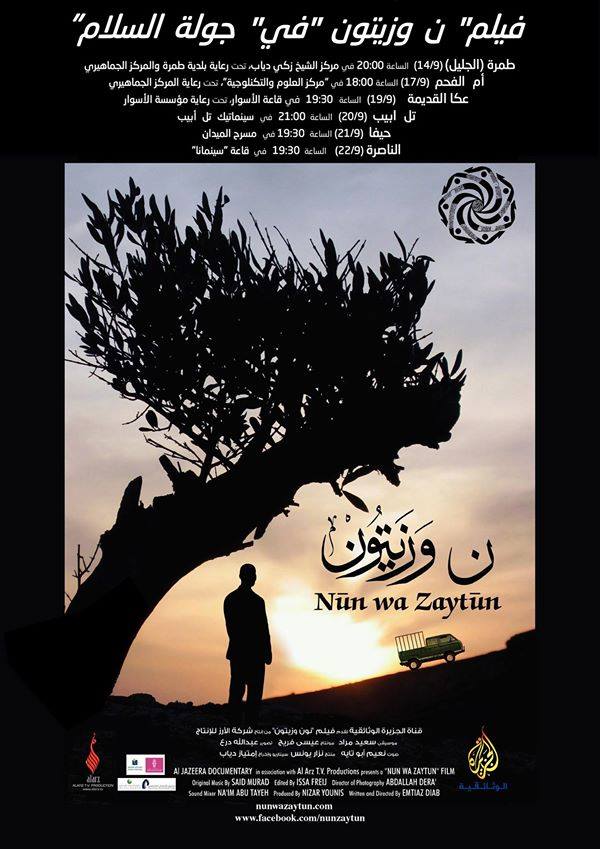 في الجولة السينمائية الأولى لفيلم "ن وزيتون" في البلاد، تكشف المخرجة امتياز دياب للجمهور وعد الإنسان الفلسطيني بأن يتذكر، وألا ينسى حبه لنفسه وأرض. بمناسبة الاحتفال الأممي "باليوم العالمي للسلام" (21/9)، ينطلق فيلم "ن وزيتون" في عروض عامة في كل من مدن أم الفحم وعكا وتل أبيب وحيفا والناصرة. وفي ختام كل عرض تعقد حوارات مع الجمهور يشارك فيها المخرجة شخصيات سياسية وثقافية.