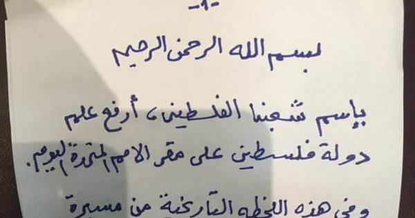 ينفرد موقع احنا Tv بنشر صورة زنكوغرافية عن نص الكلمة، بخط يد الرئيس الفلسطيني محمود عباس، والتي كان القاها اثناء رفع العلم الفلسطيني في مقر هيئة الأمم المتحدة للمرة الأولى منذ نشأتها.