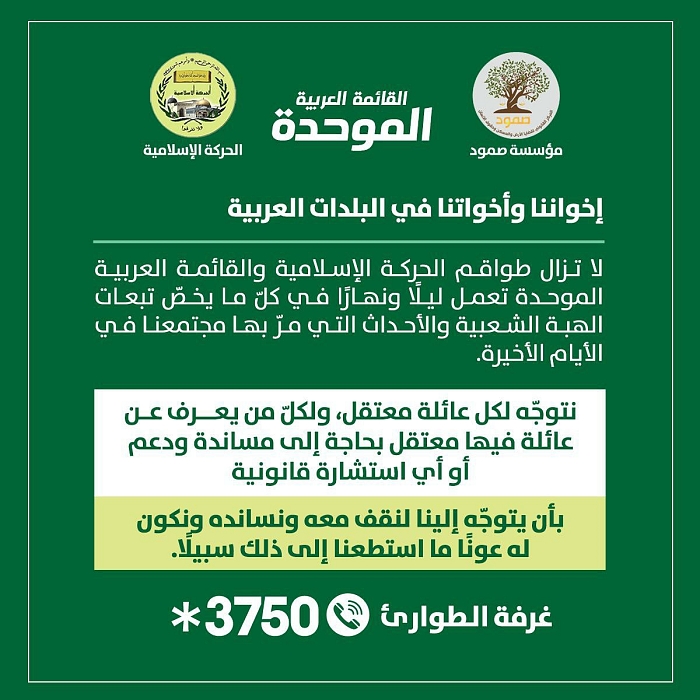 وللحصول على دعم واستشارة قانونية للمعتقلين وذويهم يمكن التواصل مع غرفة طوارئ الحركة الإسلامية والموحدة على الرقم التالي: *3750 .