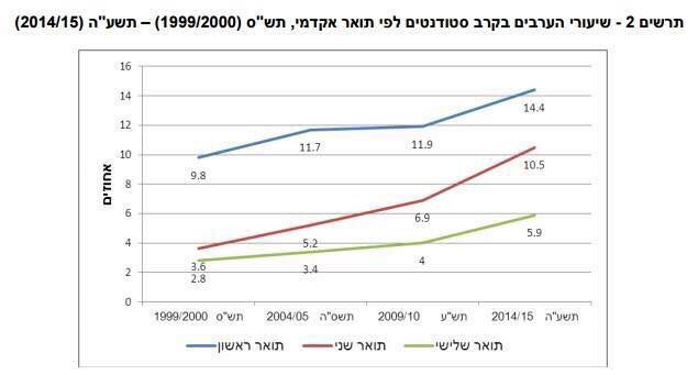 - نسبة الطالبات العربيات الملتحقات بدراسات اللقب الثاني عام ٢٠٠٠ كانت ٤٠،٩٪ من مجموع الطلاب العرب في حين ارتفعت النسبة في العام الدراسي الحالي الى ٧١٪ من مجموع الطلاب العرب.
