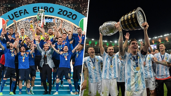 وحققت إيطاليا لقب يورو 2020 بعد فوزها في النهائي على إنجلترا بركلات الترجيح، بينما نالت الأرجنتين لقب كوبا أمريكا على حساب البرازيل، بانتصارها 1-0.