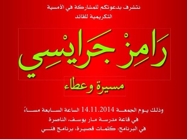 الناصرة - من لجنة الاعلام والتثقيف في جبهة الناصرة الديمقراطية – تستعد جبهة الناصرة الديمقراطية لانجاح المهرجان الجماهيري لتكريم القائد رامز جرايسي، بدعوة من الحزب الشيوعي والجبهة والذي سيعقد، مساء الجمعة، في قاعة مدرسة مار يوسف ويتخلله كلمات قصيرة وبرنامج فني وتسجيلي مصوّر.